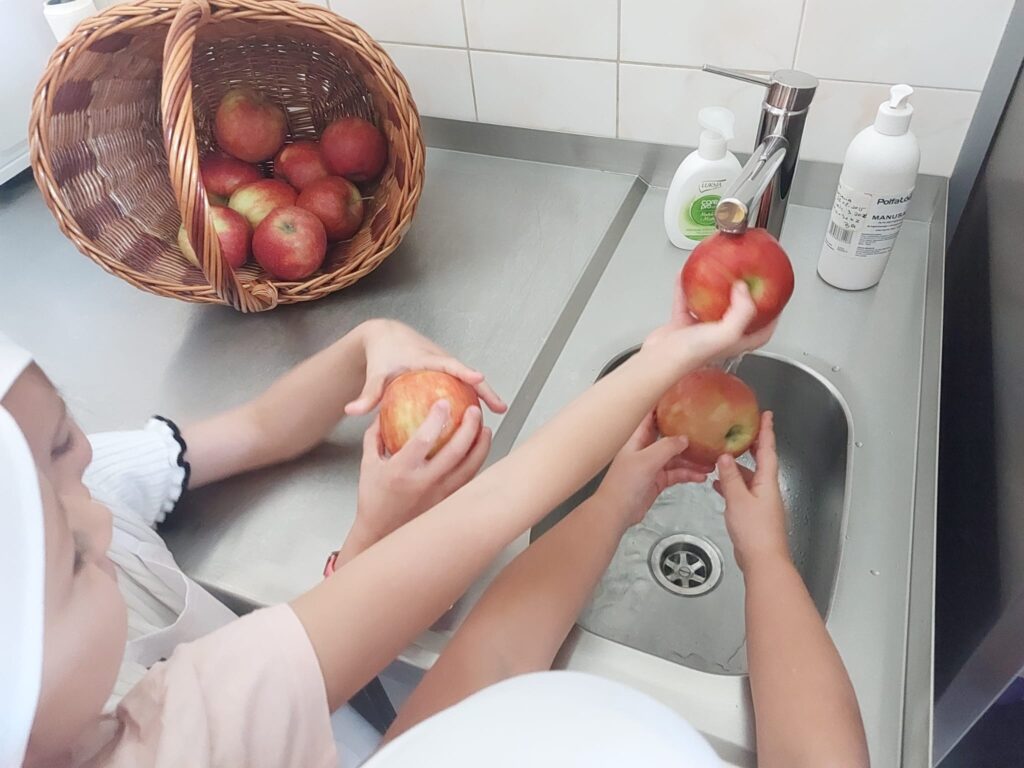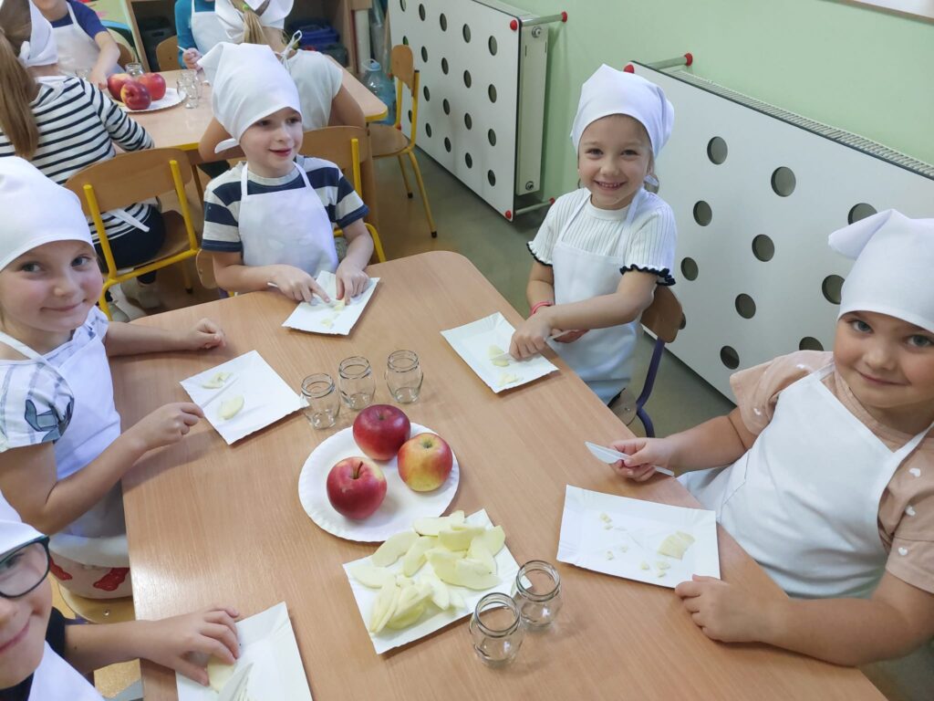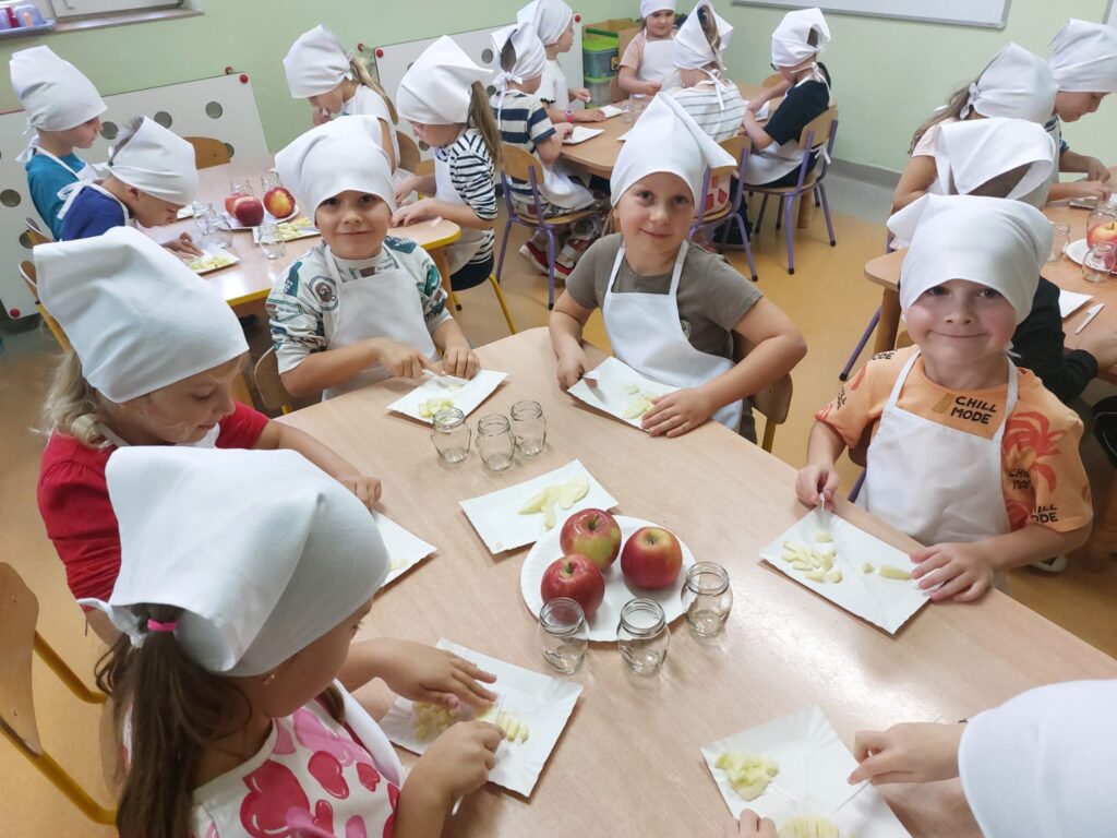 Grupa 6 latków świętowała „Dzień jabłka”. Była zabawa, nauka i zajęcia kulinarne.